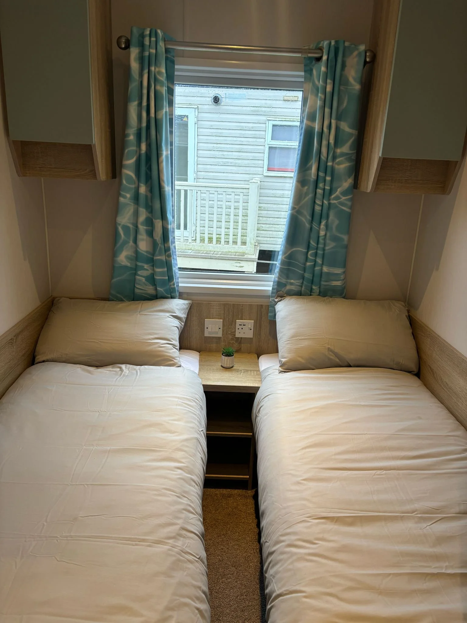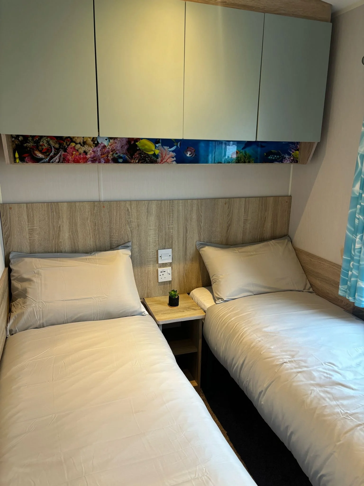 The first of the two twin bedrooms comes with overhead storage, and a wadrobe, so there is plenty of room to unpack. The middle bedside table can be moved and the beds pushed together if requested, to create a double bedroom.